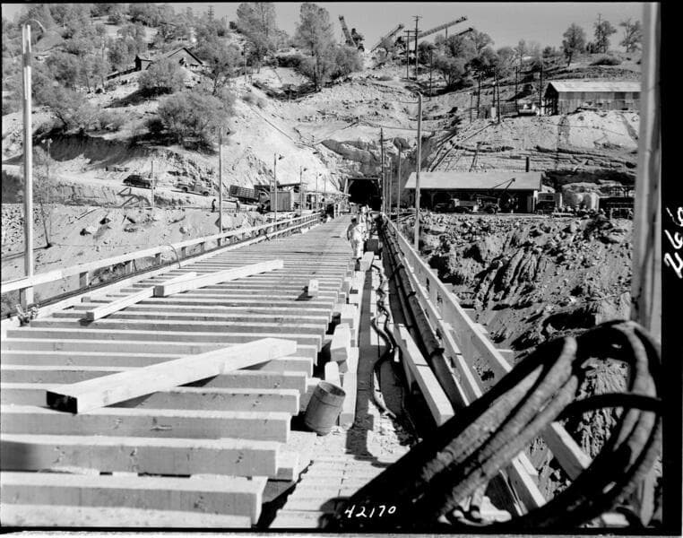 Big Creek Powerhouse #4 - Construction pictures taken by Dam & Tunnel office. [View from Power Tunnel #2 intake portal to Power Tunnel #1 outlet portal at Willow Creek Crossing.]