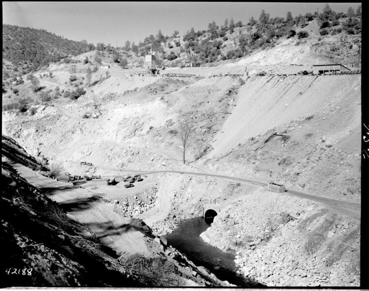 Big Creek Powerhouse #4 - Construction pictures taken by Dam & Tunnel Office. [diversion tunnel intake portal with water flowing through]