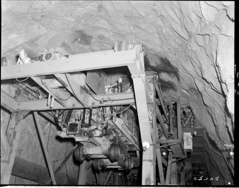 Big Creek Powerhouse #4 - Construction pictures taken by Dam & Tunnel office. [Removing railcar full of tailings; passing under elevated empty railcar in tunnel on the way out.]