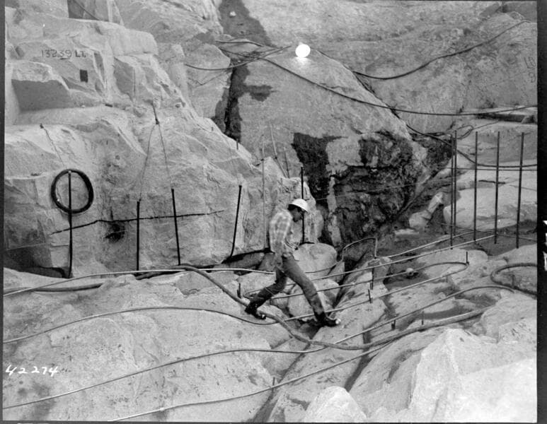 Big Creek Powerhouse #4 - Construction pictures taken by Dam & Tunnel office. [Preparing bedrock for first concrete footing pour - cooling lines and reinforcing steel anchored into bedrock]
