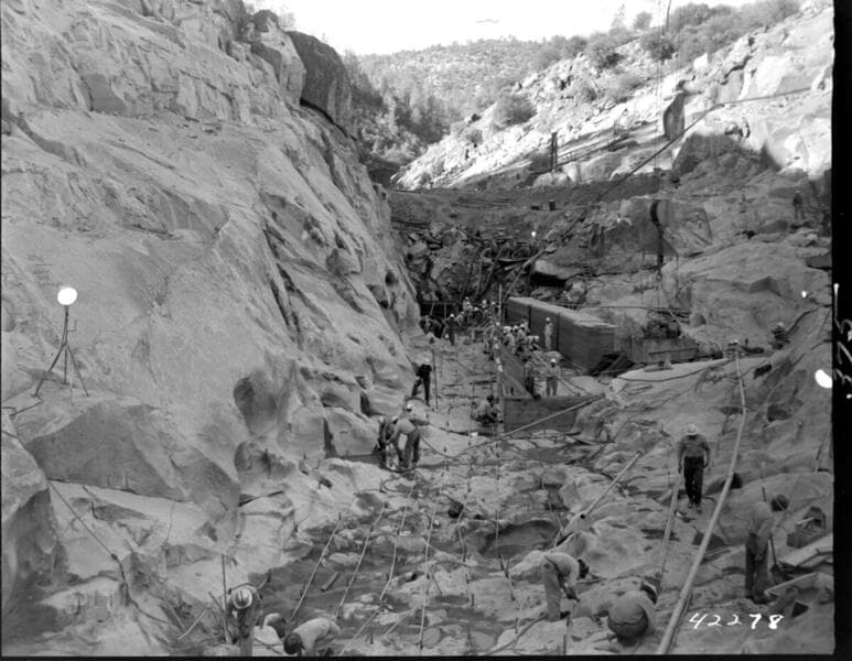 Big Creek Powerhouse #4 - Construction pictures taken by Dam & Tunnel office. [Dam 7 foundation blocks being placed on bedrock. Forms in place for corridor inside dam]