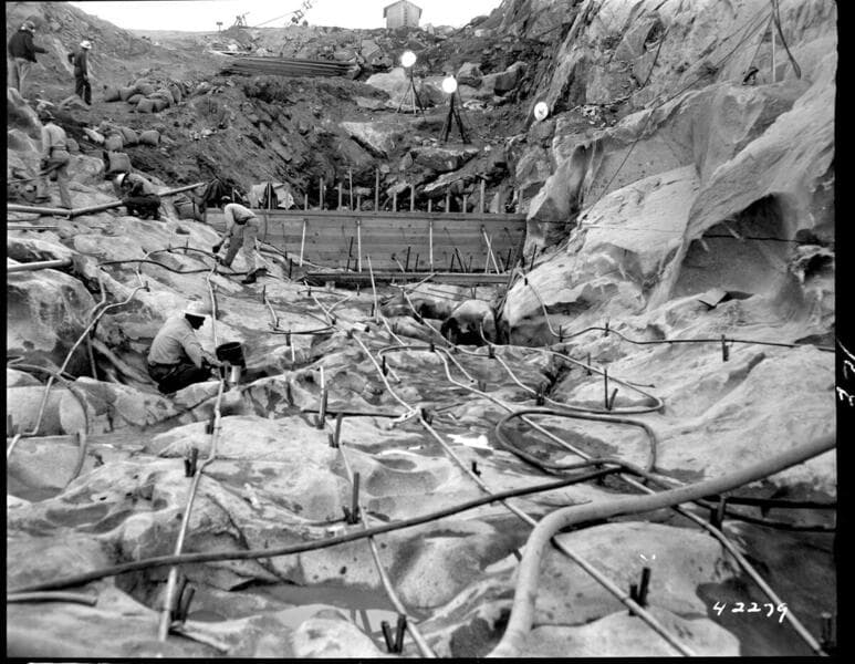 Big Creek Powerhouse #4 - Construction pictures taken by Dam & Tunnel office. [Dam 7 foundation blocks being placed on bedrock. Forms in place for corridor inside dam]
