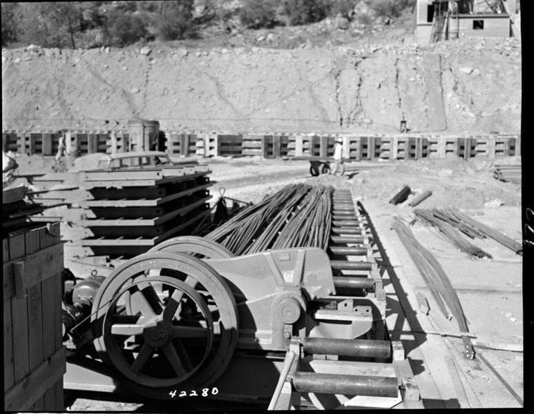 Big Creek Powerhouse #4 - Construction pictures taken by Dam & Tunnel office. [steel concrete form sections at material supply yard]