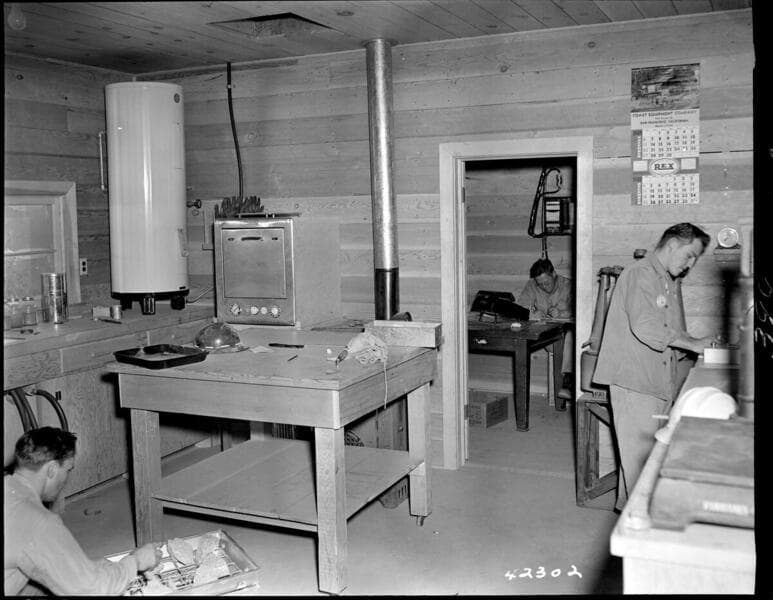 Big Creek Powerhouse #4 - Construction pictures taken by Dam & Tunnel office. [Field employment office with safety record sign on roof]