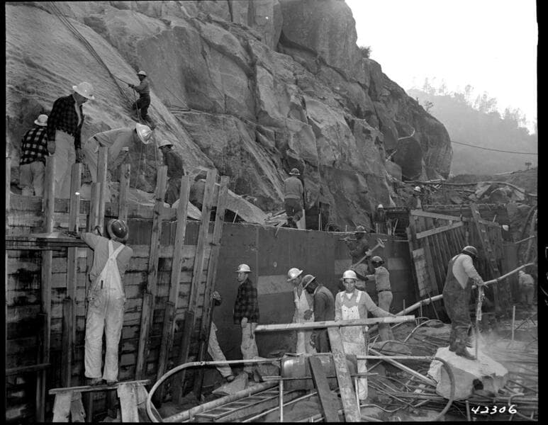 Big Creek Powerhouse #4 - Construction pictures taken by Dam & Tunnel office. [Dam 7 foundation blocks being placed on bedrock. Forms in place for corridor inside dam]