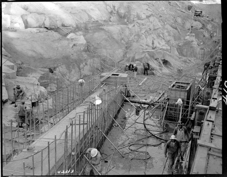 Big Creek Powerhouse #4 - Construction pictures taken by Dam & Tunnel office. [Dam 7 foundation blocks being placed on bedrock. Forms in place for corridor inside dam]