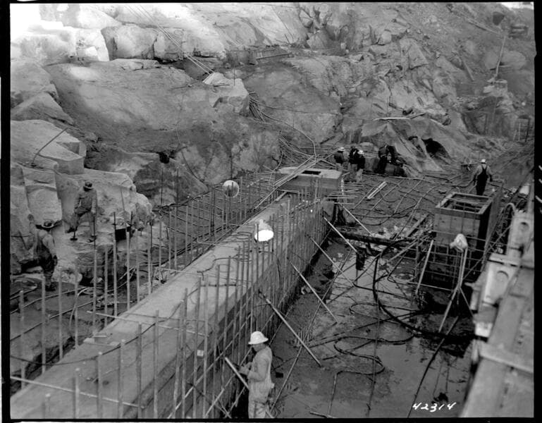 Big Creek Powerhouse #4 - Construction pictures taken by Dam & Tunnel office. [Dam 7 foundation blocks being placed on bedrock. Forms in place for corridor inside dam]