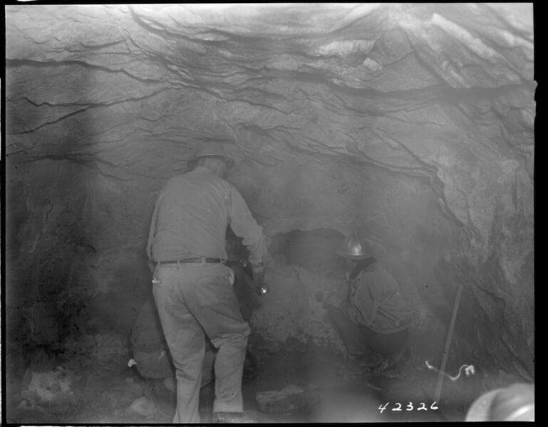 Big Creek Powerhouse #4 - Construction pictures taken by Dam & Tunnel office. Diversion Tunnel "Holing Thru". [Men in Tunnel #1]