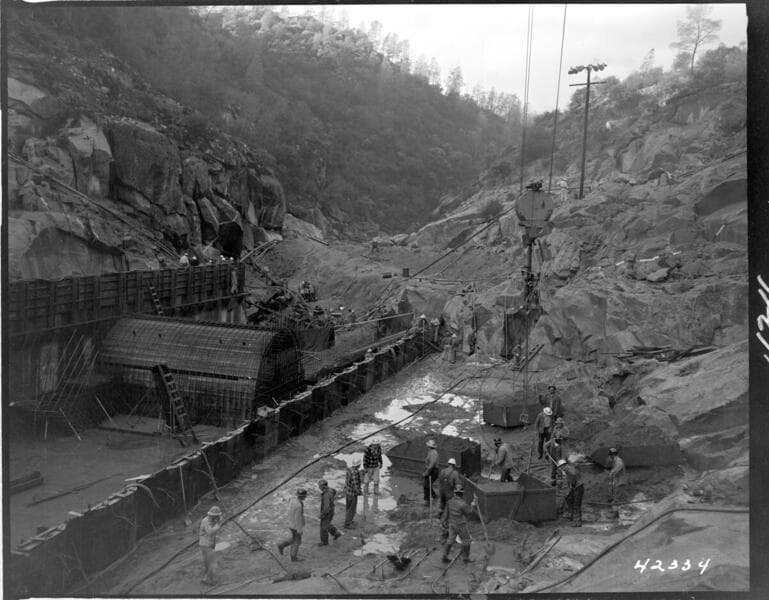 Big Creek Powerhouse #4 - Construction pictures taken by Dam & Tunnel Office. [Dam 7 construction - concrete placement in block forms at upper level]