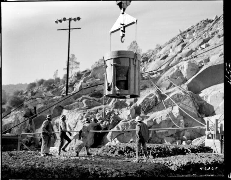 Big Creek Powerhouse #4 - Construction pictures taken by Dam & Tunnel office. [Overhead view of 4 yard bucket (suspended by cable hoist) dumping concrete into block section of Dam 7]