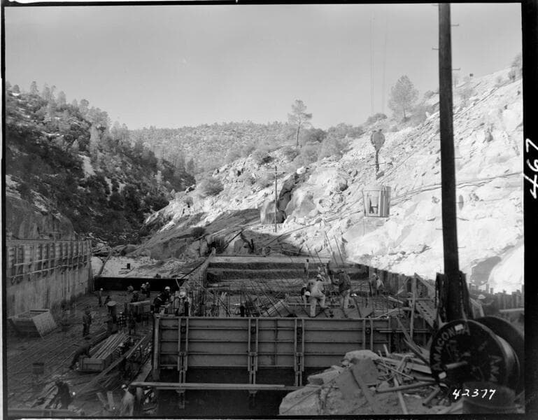 Big Creek Powerhouse #4 - Construction pictures taken by Dam & Tunnel office. [Overhead view of 4 yard bucket (suspended by cable hoist) dumping concrete into block section of Dam 7]