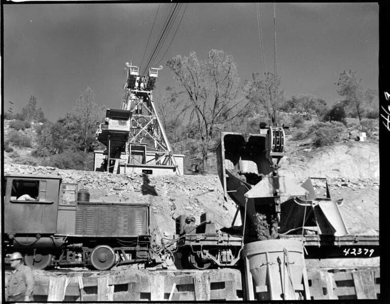 Big Creek Powerhouse #4 - Construction pictures taken by Dam & Tunnel Office. [dump bucket on railcar filling cable hoist dump bucket with concrete for Dam 7 placement]