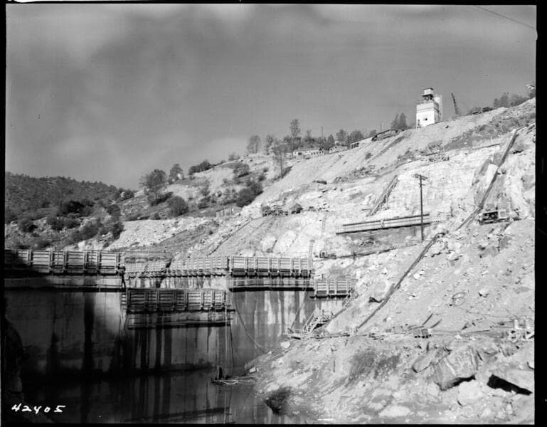 Big Creek Powerhouse #4 - Construction pictures taken by Dam & Tunnel Office. [Dam 7 progress - Batch Plant on left]
