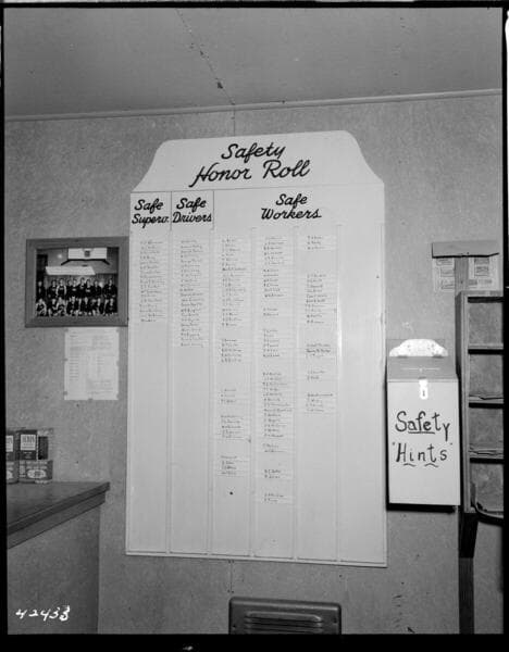 Big Creek Powerhouse #4 - Construction pictures taken by Dam & Tunnel office. [Safety Bulletin Board - with monthly "Lost Time Accidents" record posted]