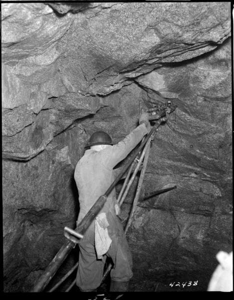 Big Creek Powerhouse #4 - Construction pictures taken by Dam & Tunnel Office. [Hard rock miners drilling in Power Tunnel #2]