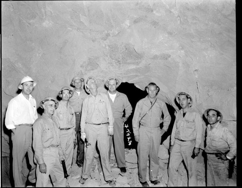 Big Creek Powerhouse #4 - Construction pictures taken by Dam & Tunnel Office. [Leadmen posed outside Tunnel 2 where record was set]