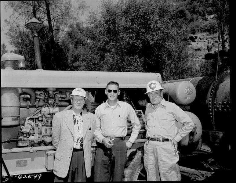 Big Creek Powerhouse #4 - Construction pictures taken by Dam & Tunnel Office. [Men posed in group where Tunnel #2 holed thru]