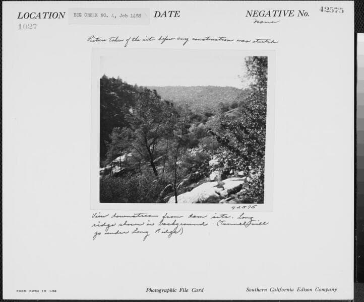 Big Creek Powerhouse #4 - Photo taken at site before any construction was started. View downstream from footbridge. Long Ridge in background.