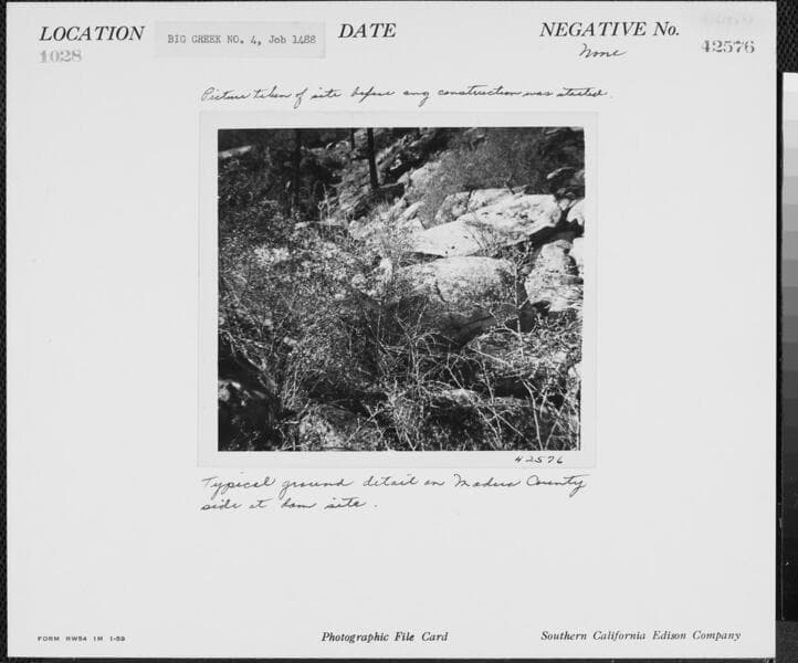 Big Creek Powerhouse #4 - Photo taken at site before any construction was started. View of Madera County side of canyon at dam site showing large granite blocks