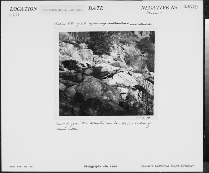 Big Creek Powerhouse #4 - Photo taken at site before any construction was started. View of Madera County side of canyon at dam site showing large granite blocks