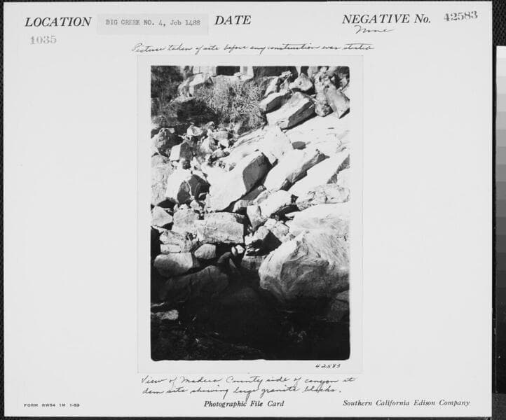 Big Creek Powerhouse #4 - Photo taken at site before any construction was started. View of granite blocks on Madera side of dam site.
