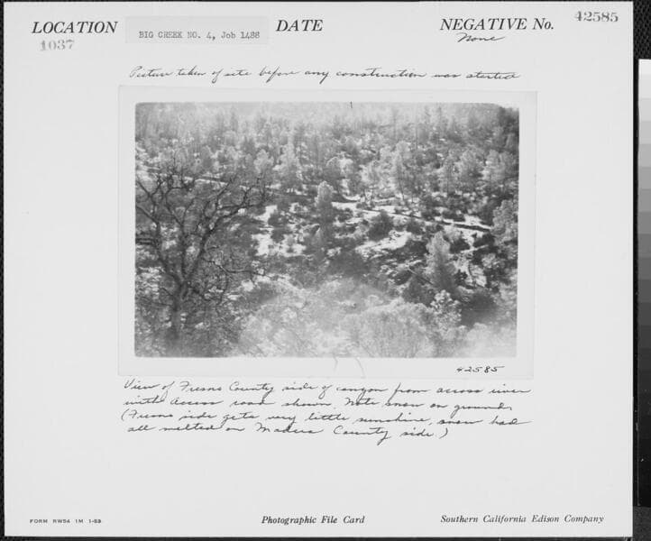 Big Creek Powerhouse #4 - Photo taken at site before any construction was started. View up river from above footbridge. Note steep side on channel on Fresno County side (right side of picture)