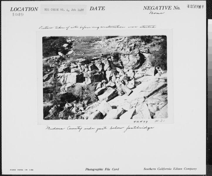 Big Creek Powerhouse #4 - Photo taken at site before any construction was started. Detail of Madera County side just above footbridge.
