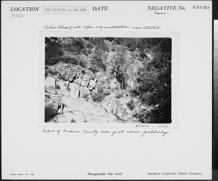 Big Creek Powerhouse #4 - Photo taken at site before any construction was started. Detail of Madera County side just above footbridge, showing more vertical detail than #36.