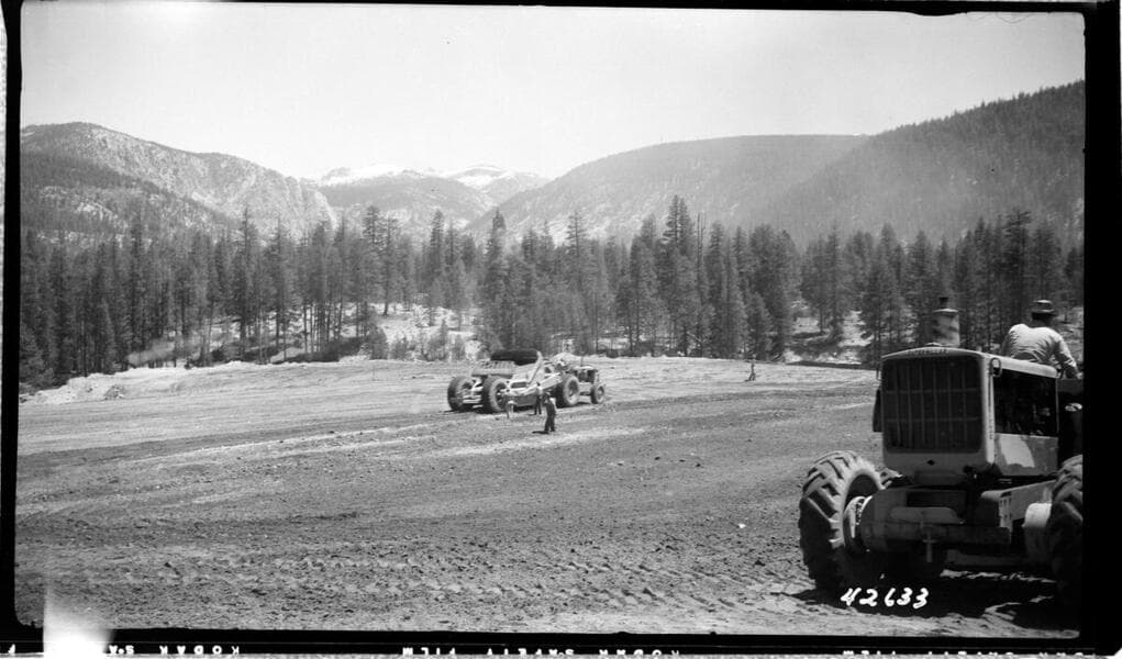 Big Creek, Vermilion Dam - Placing fill in creek section of dam.
