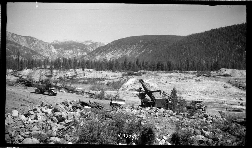 Big Creek, Vermilion Dam - D-8 [Cat] and rock rack clearing boulders from east abutment.