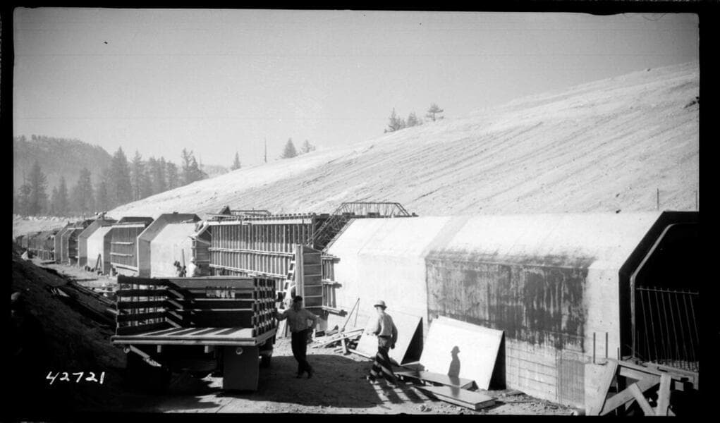 Big Creek, Vermilion Dam - Outlet Conduit, view north, showing excavation of outlet channel and outlet conduit; also fill at dam.