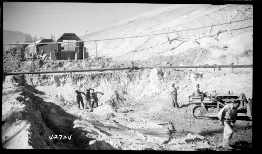 Big Creek, Vermilion Dam - Excavating fine sand and boulders for blanket upstream from outlet conduit.