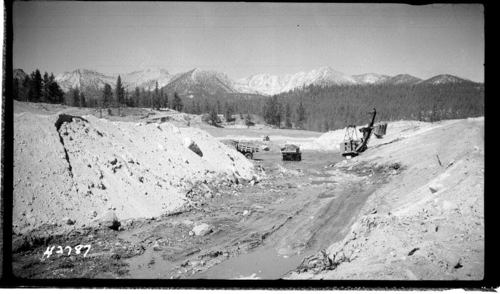 Big Creek, Vermilion Dam - Spillway channel at confluence with Mono Creek after initial spill. Dozer clearing channel to lower water backed up in Mono Creek. Compare with 44629 & 44632.