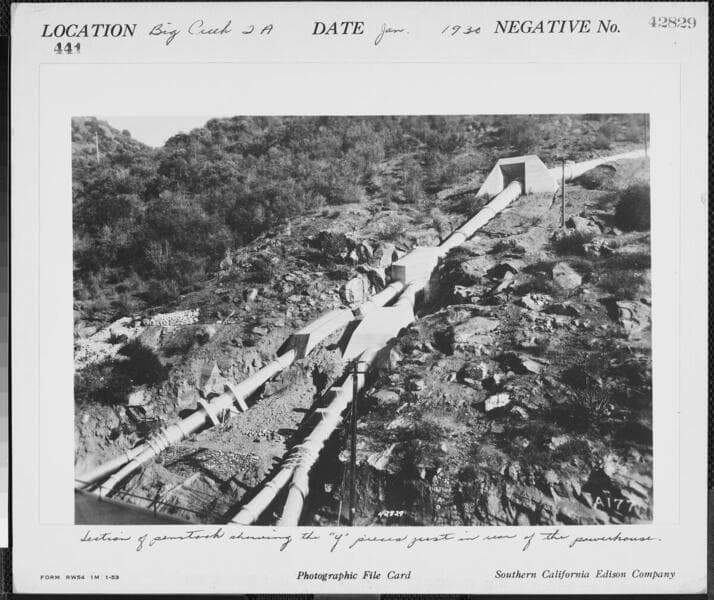 Big Creek Powerhouse 2A - Penstock "Y" near plant, showing installation of bulk-head which will shut off water to #1 generator.