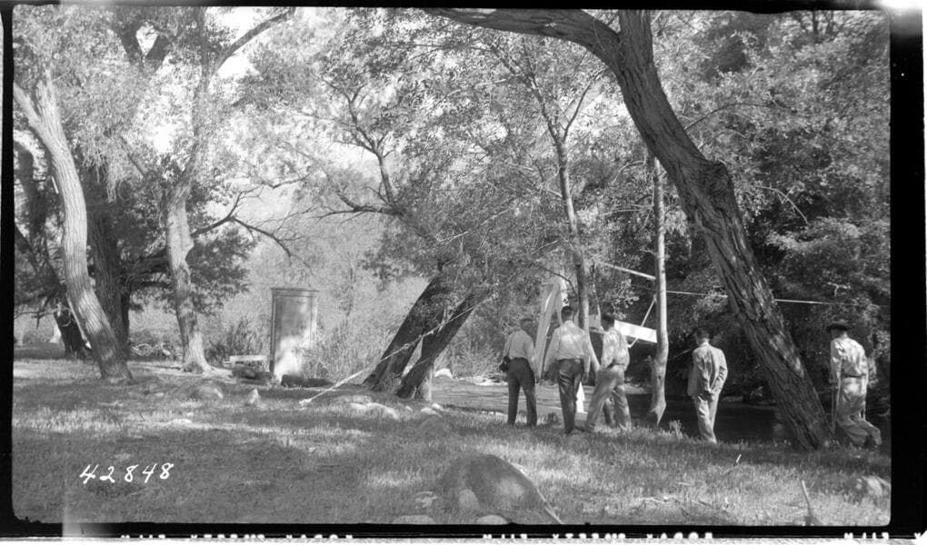 Borel Powerhouse - Borel Canal - Seepage test. Flag shows bench mark on head wall at South end of Kern River Flume.