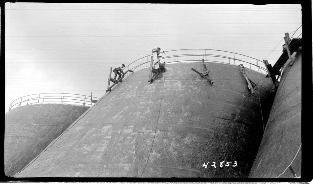 Big Creek, Florence Lake Dam - Record photo of upstream face of Arches 50 to 58 inclusive in fifth tangent. All arches except 53 coated with J-M Asbestile waterproofing during Dec. 1942.