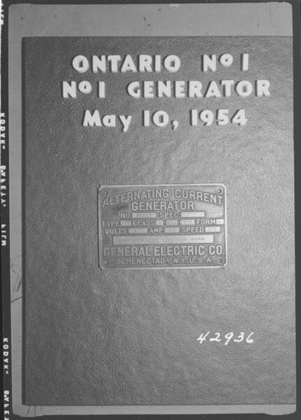 Ontario No. 3 Powerhouse - Generator Name Plate for Unit 1