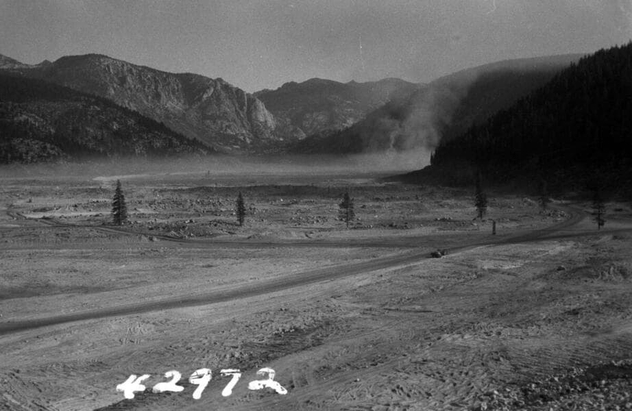 Big Creek, Vermilion Dam - Clearing west abutment Vermilion Dam. Area in foreground prepared for test fill except for surface skimming.