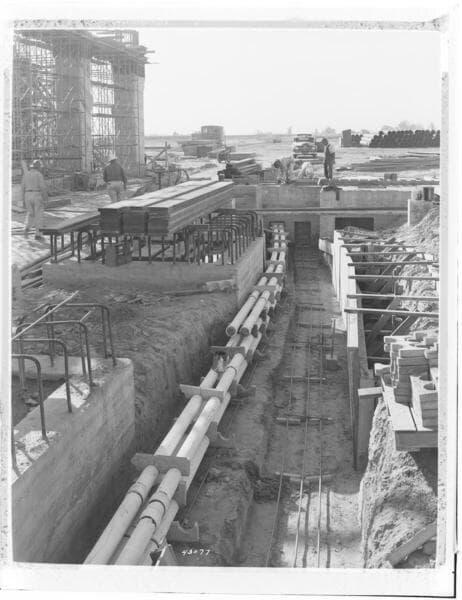 Etiwanda Steam Station - Placing 108" precast pipe sections for circulating water pump section view looking east from Anchor #5.