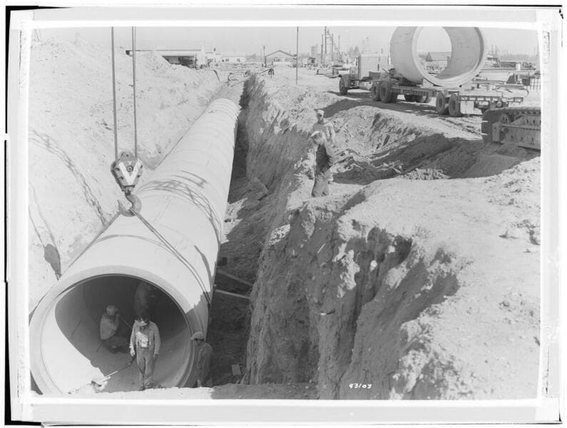 Etiwanda Steam Station - Installation of steel circulating water pipe looking east from "Y" section in pump discharge line.