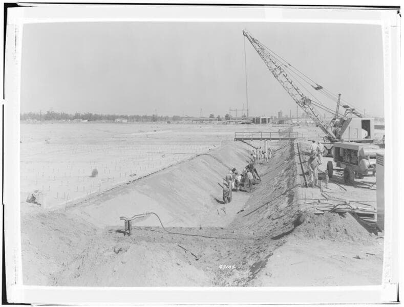 Etiwanda Steam Station - View of gunite lining operations in the water storage reservoir looking north from southwest corner.