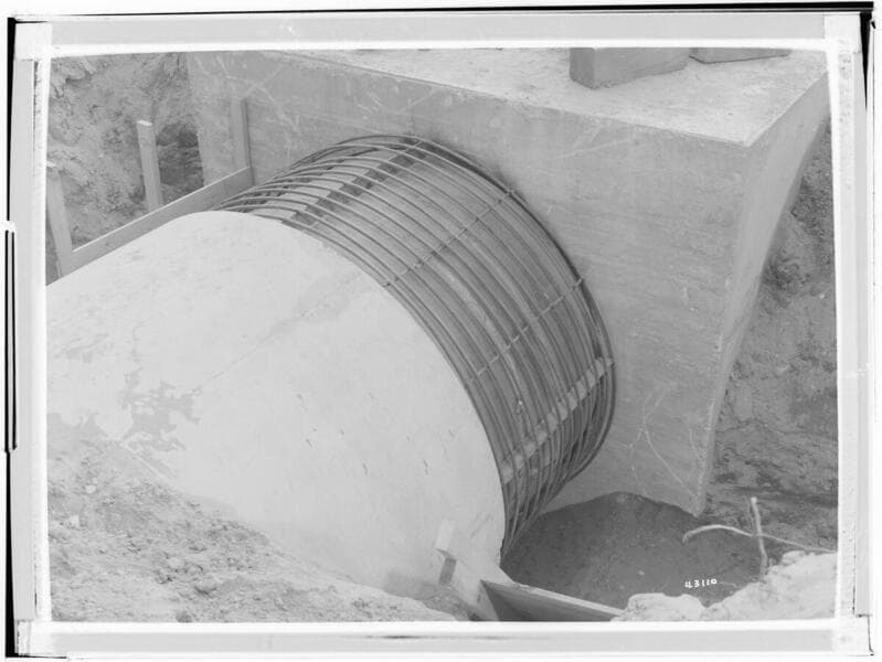 Etiwanda Steam Station - Placing 108" precast pipe sections for circulating water pump section view looking east from Anchor #5.