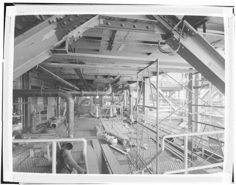 Etiwanda Steam Station - General view of Unit #1 auxiliary bay looking west at mezzanine level. Erection of 6th point heater at #1 condenser.