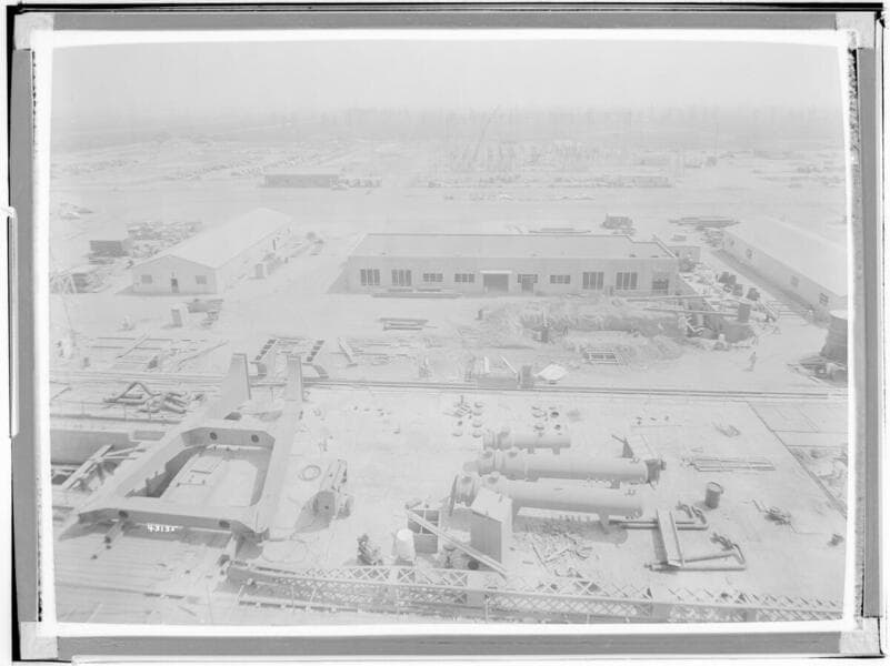 Etiwanda Steam Station - General view of cooling tower & fuel oil storage tank areas, looking west from top of boiler support steel.