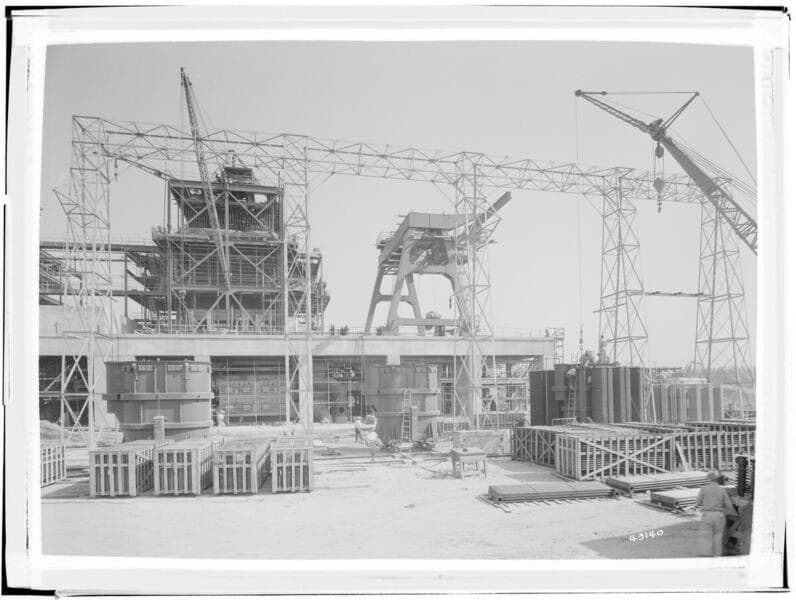 Etiwanda Steam Station - Looking south showing progress on boiler erection. Boiler #1 on left #2 on right.