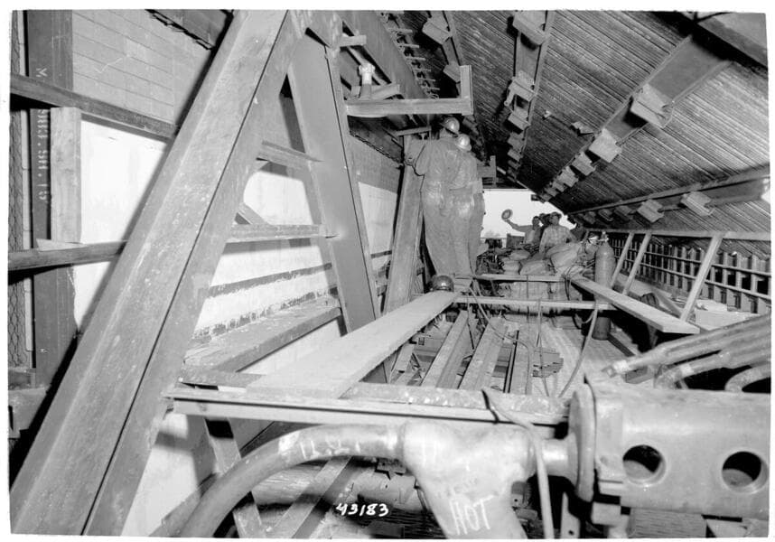 Etiwanda Steam Station - General view showing low temperature superheater elements of Boiler #1 - Rear steam cooled tubes are on rear left, front steam cooled wall tubes on right.