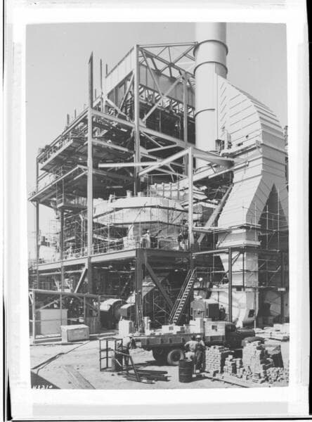 Etiwanda Steam Station - View of top of Unit #2 turbine support - looking northeast showing erection of structural steel for #1 Boiler.