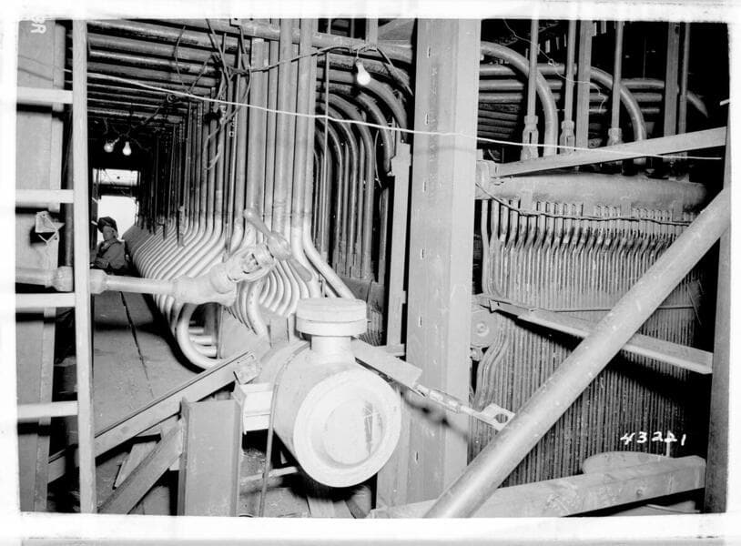 Etiwanda Steam Station - Progress of erection - Boiler #1 showing interior of reheat section on left and furnace area on right.