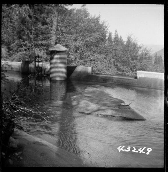 Big Creek Hydrographics - "Chinquapin Creek Diversion Dam", looking downstream showing weir, gauging station, and trash rack over outlet pipe.