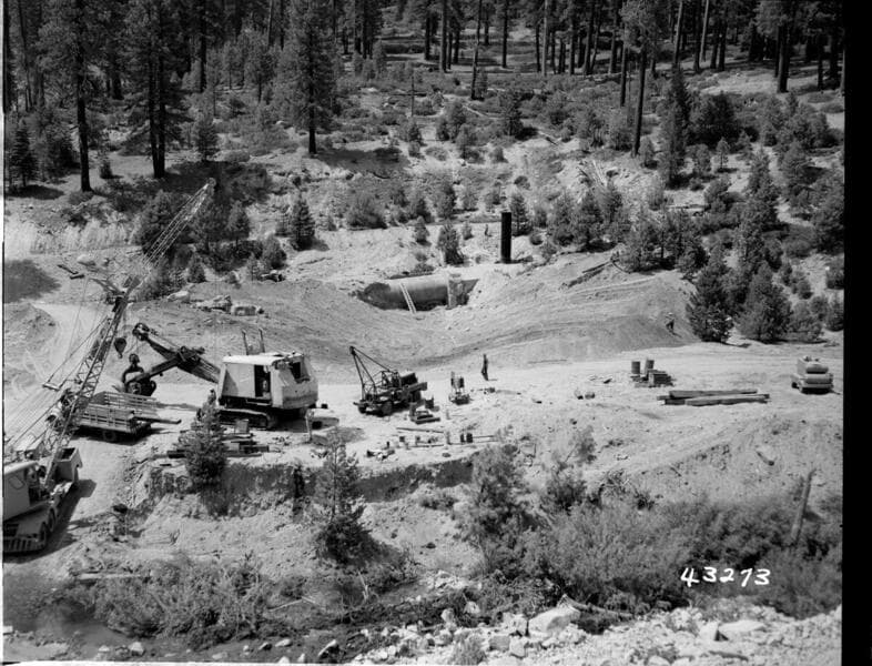 Portal Powerhouse - View of tunnel diversion during test flow of 490 cfs. Flow in diversion ditch from 12' pipe to junction with Rancheria Creek channel.